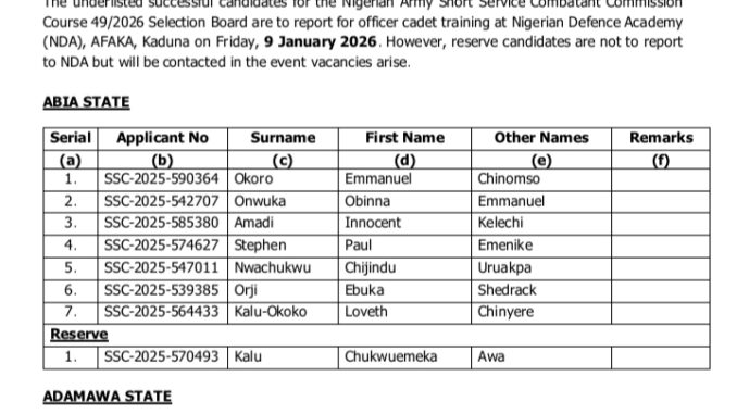 The Nigerian Army wishes to inform the general public the released of list of successful candidates for Short Service Combatant Commission Course 49/2026 Selection Board. Candidates whose names appeared on the Nigerian Army Portal at recruitment.army.mil.ng are to report for officer cadet training at the Nigerian Defence Academy (NDA), AFAKA, Kaduna on Friday, 9th January, 2026.