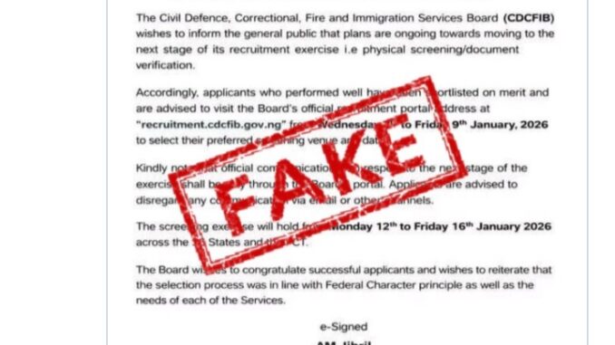 The fake circular falsely claimed that physical screening and document verification for shortlisted candidates would soon commence, advising applicants to visit a recruitment portal between January 7th and January 9th, 2026, to select preferred venues and dates. It further stated that the screening exercise would reportedly hold between January 12th and 16th, 2026, across all states and the FCT.