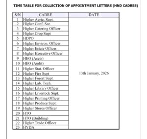 According to the Commission, the collection of appointment letters will commence in January 2026 and will be conducted in phases based on cadres, in order to ensure an orderly and smooth process. Successful candidates are therefore advised to strictly adhere to the dates assigned to their respective cadres to avoid unnecessary delays or inconveniences.