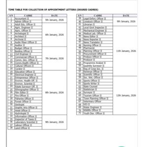 For Degree cadres, the collection of appointment letters will begin on Monday, 5th January 2026. On this day, candidates recruited as Accountant II and Administrative Officer II are scheduled to collect their appointment offers.