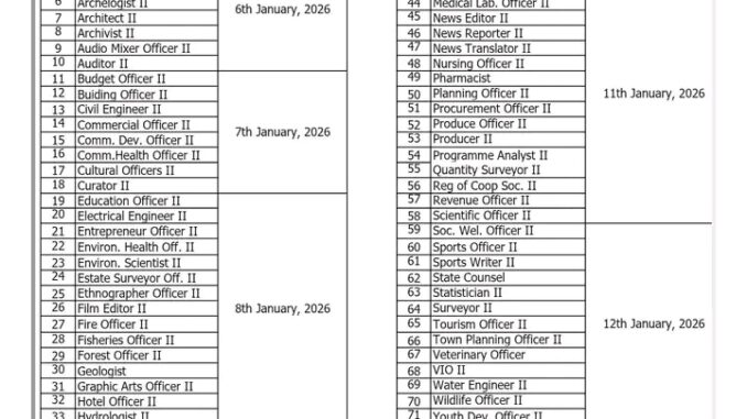 Candidates in the cadres of Information Officer II, Inspector of Taxes II, Laboratory Scientist II, Labour Officer II, Land Officer II, Legal Enforcement Officer II, Livestock Officer II, and Librarian II are scheduled for Friday, 9th January 2026.