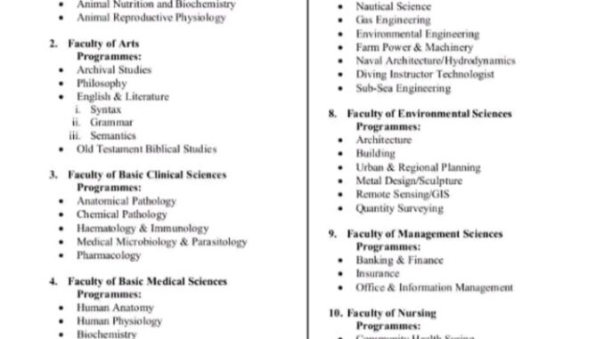 Additional professional requirements include M.Eng or M.Tech registrable with COREN for Engineering, M.Sc or M.Tech registrable with ARCON, CORBON, ESVABON, NES, QSRBN, SURCON or TOPREC for Environmental Sciences, B.MLS plus a Master’s degree for Medical Laboratory Sciences, B.N.Sc with RN and a Master’s degree for Nursing Sciences, Pharm.D with PCN registration for Pharmacy, and MBBS with Ph.D or Fellowship and MDCN registration for Clinical Sciences and Medical Doctors.