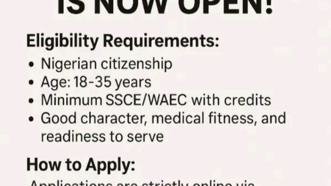Applicants must be Nigerian citizens by birth and fall within the age bracket of 18 to 35 years. A minimum educational qualification of SSCE/WAEC with required credits is acceptable, while candidates with higher qualifications such as ND, HND, or B.Sc. degrees have an added advantage. Applicants must also be of good character, medically fit, and willing to serve anywhere in Nigeria if employed.