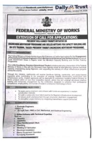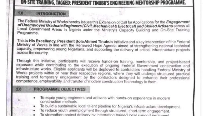 The Federal Ministry of Works has announced an extended call inviting unemployed graduate engineers and skilled technical workers across Nigeria to participate in a nationwide capacity building and on-site training initiative. This programme forms part of a broader national development drive championed by President Bola Ahmed Tinubu under the Renewed Hope Agenda, with a strong focus on youth empowerment, technical competence, and infrastructure delivery.
