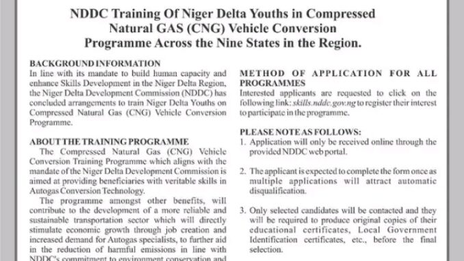 Apply for the Niger Delta Development Commission (NDDC) Skills Development Training and Empowerment Programme on Compressed Natural Gas (CNG) Vehicle Conversion for Niger Delta Youths Across the Nine States of the Region.