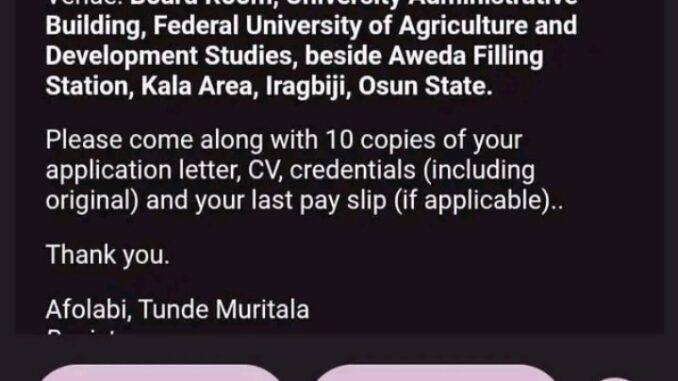 The Federal University of Agriculture and Development Studies Iragbiji, Osun State, has commenced the issuance of interview invitations to candidates who applied for various positions in the institution.