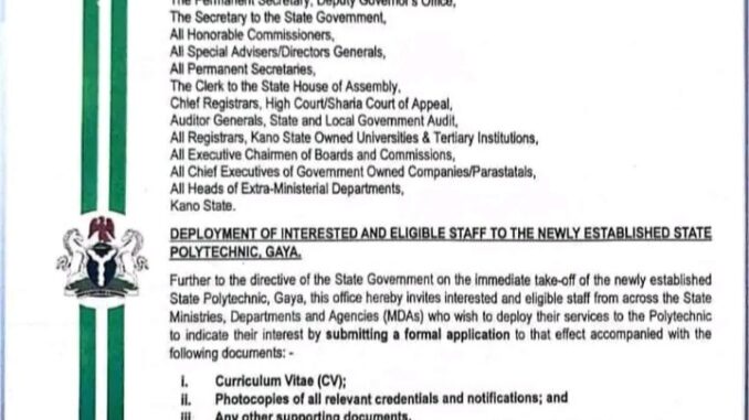 The Kano State Government has formally commenced the deployment of qualified and interested civil servants to the newly established Kano State Polytechnic, Gaya, marking a significant milestone in the institution’s journey toward full academic and administrative operations.