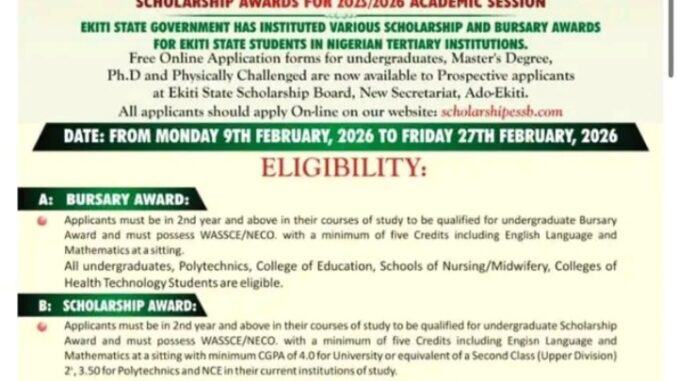 The Ekiti State Scholarship Board has opened a portal for the 2025/2026 academic session scholarship and bursary application and is inviting indigenes of Ekiti State who are currently pursuing higher education in tertiary institutions across Nigeria, including the prestigious Nigerian Law School to apply.